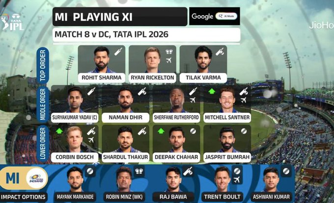 The innings began with some early promise as Ryan Rickelton and Rohit Sharma found boundaries in the opening overs. Rickelton played a couple of elegant flicks, while Rohit looked in good touch with crisp strokes through the off and leg sides. But Mukesh Kumar quickly turned the tide in Delhi’s favour with disciplined bowling.