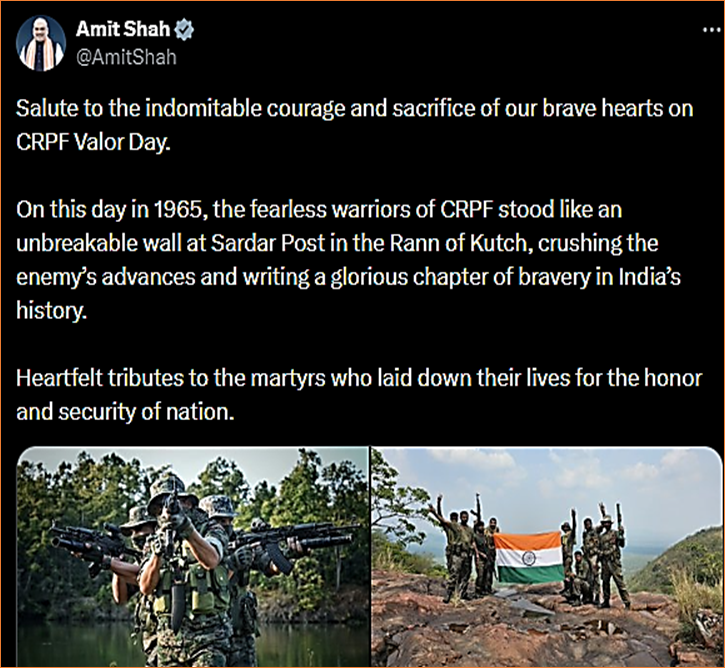 The Union Home Minister Amit Shah took to his “X” handle where he posted: “Salute to the indomitable courage and sacrifice of our brave hearts on CRPF Valour Day. On this day in 1965, the fearless warriors of CRPF stood like an unbreakable wall at Sardar Post in the Rann of Kutch, crushing the enemy’s advances and writing a glorious chapter of bravery in India’s history. Heartfelt tributes to the martyrs who laid down their lives for the honour and security of nation”.