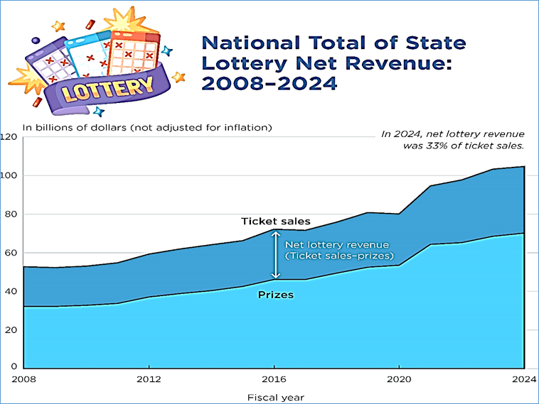 Washington DC; April 2026: According to the U.S. Census Bureau’s recently released Annual Survey of State Government Finances (ASFIN) report – State lottery ticket sales nearly doubled nationally from $52.8 billion to $104.7 billion between fiscal years (FY) 2008 and 2024.