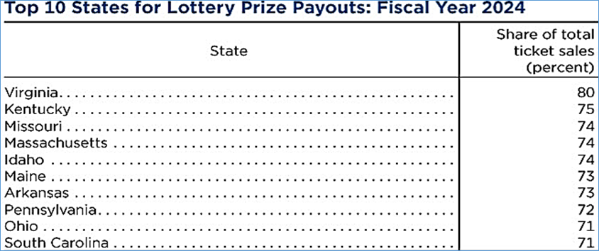 Virginia paid out 80% of its lottery ticket sales in prizes in FY 2024, the biggest share of any state. It was followed by Kentucky at 75%, and Missouri, Massachusetts and Idaho tied at 74%.