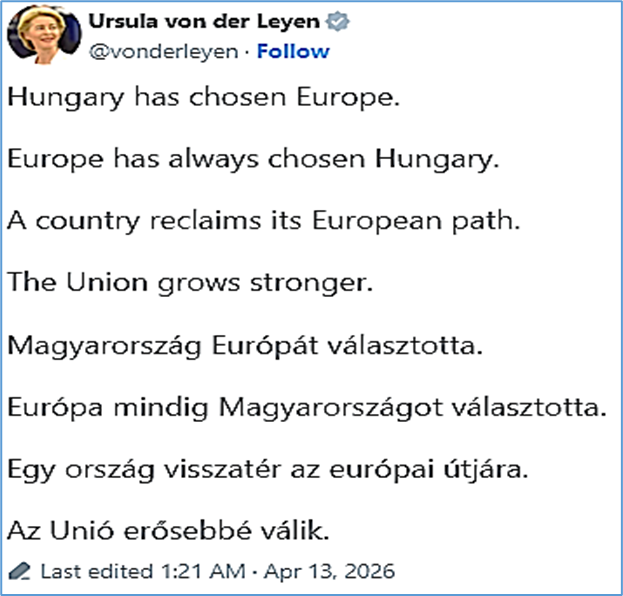 What is believed to be a matter for rejoice – President of the European Union, Ursula von der Leyen today (13th April 2026) have said that Hungary chose Europe, after Hungary’s long-serving Prime Minister Viktor Orban conceded defeat in the parliamentary elections. Von der Leyen said that the European Union has now become stronger.