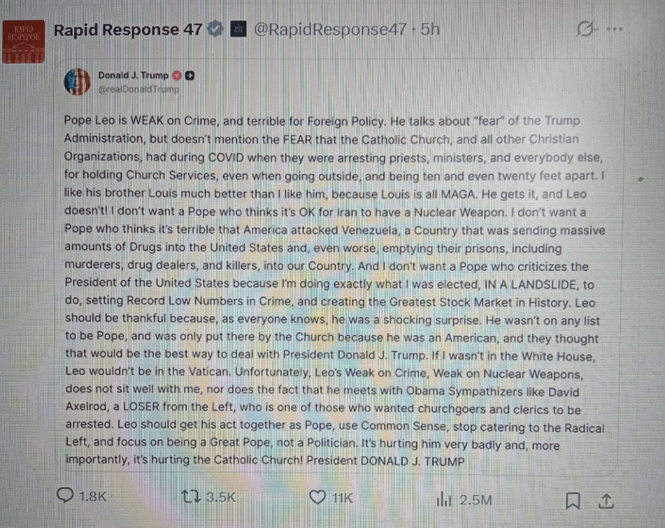 The attack comes amid growing differences between the two figures over international conflicts and humanitarian issues. Pope Leo XIV, the first American-born leader of the Catholic Church, has in recent weeks called for restraint, peace, and dialogue, especially in relation to escalating tensions involving Iran.