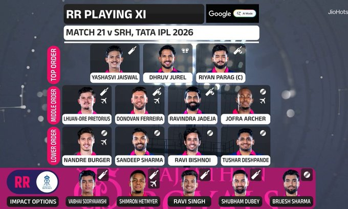 Rajasthan Royals introduced left-handed batter Lhuan-dre Pretorius and right-arm pacer Tushar Deshpande into the lineup. Deshpande replaced Brijesh Sharma, while Pretorius came in as Shimron Hetmyer was rested. The changes reflect RR’s intent to maintain their winning momentum, having arrived for this contest on the back of four consecutive victories this season.