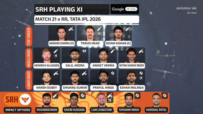 With RR aiming to extend their winning streak and SRH eager to regain form on home turf, the match promises an exciting contest between two competitive sides.