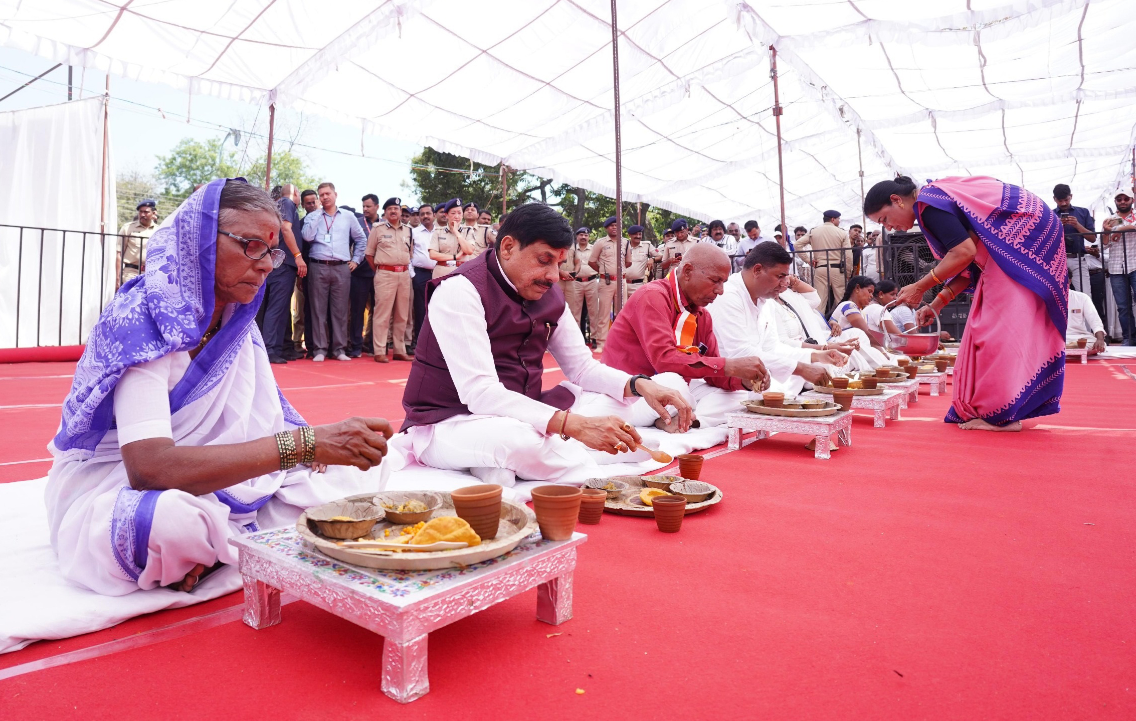 Chief Minister Dr. Yadav shared a community meal with followers who had arrived from various states at the birth anniversary event, conveying a strong message of social harmony. Sitting in rows with devotees, he said