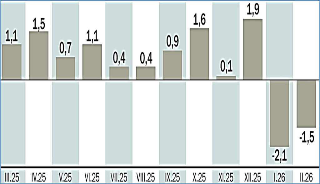 Moscow; April 2026: The start of 2026 has been unfavorable for the Russian economy: (-2.1) % of GDP in January and (-1.5) % in February, according to the Ministry of Economic Development and Trade, based on Rosstat data. Statistics on “negative growth” and negative production dynamics in the civilian sector indicate that the economy is sliding into crisis.