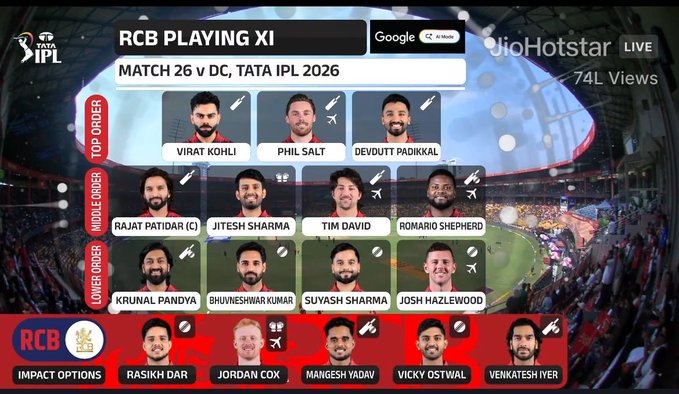 RCB have enjoyed a strong start to their title defence, winning four of their first five matches, while Delhi Capitals entered the contest after a week-long break, looking to snap a two-match losing streak. Speaking after the toss, Axar Patel cited conditions as a key factor behind his decision.