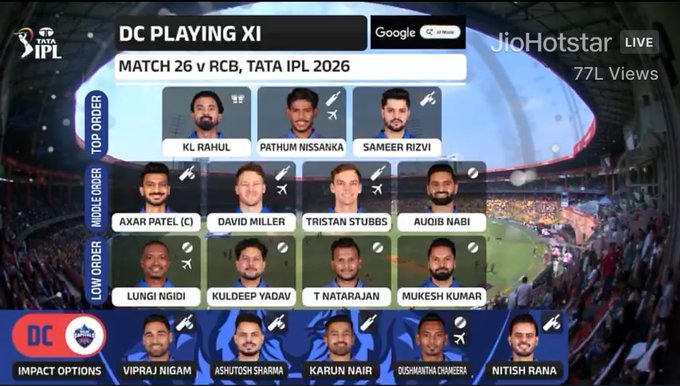 Delhi Capitals: Pathum Nissanka, KL Rahul (wk), Sameer Rizvi, Axar Patel (c), David Miller, Tristan Stubbs, Auqib Nabi Dar, Lungi Ngidi, Kuldeep Yadav, T Natarajan, Mukesh Kumar