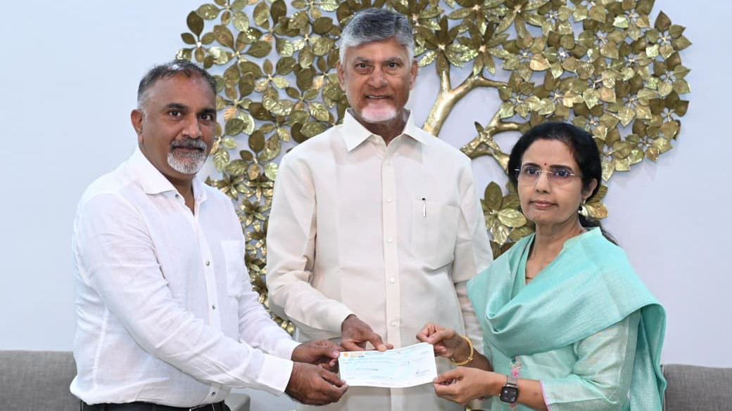 Bhuvaneswari, who serves as Vice-Chairperson and Managing Director of Heritage Foods and Managing Trustee of the NTR Memorial Trust, handed over the cheque along with her husband. The donation will ensure that meals are served free of cost for a day at all 269 Anna Canteens functioning across Andhra Pradesh.