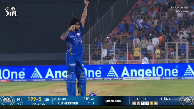 The duo of Tilak and Dhir stitched together a steady partnership, rotating the strike smartly while punishing loose deliveries. Their 52-run stand brought Mumbai Indians back into the contest, taking the score to 75/3 by the halfway mark. Just when the partnership was beginning to flourish, Prasidh Krishna struck in the 13th over, dismissing Dhir for a well-made 45 off 32 balls as he was caught in the deep.