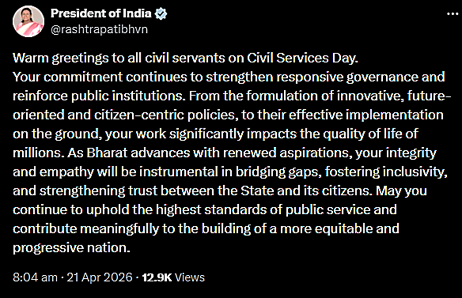 India’s progress. May our civil servants continue to serve with excellence, compassion and innovation, upholding the highest standards of duty”.