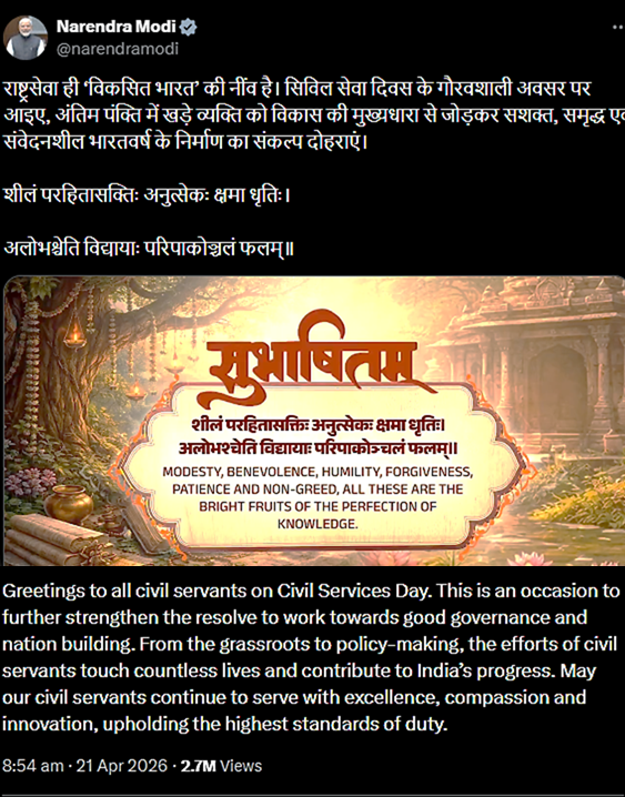In an X post, the Prime Minister wrote, “Greetings to all civil servants on Civil Services Day. This is an occasion to further strengthen the resolve to work towards good governance and nation-building. From the grassroots to policy-making, the efforts of civil servants touch countless lives and contribute to