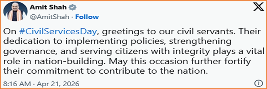 “On Civil Services Day, greetings to our civil servants. Their dedication to implementing policies, strengthening governance, and serving citizens with integrity plays a vital role in nation-building. May this occasion further fortify their commitment to contribute to the nation”, Shah wrote.