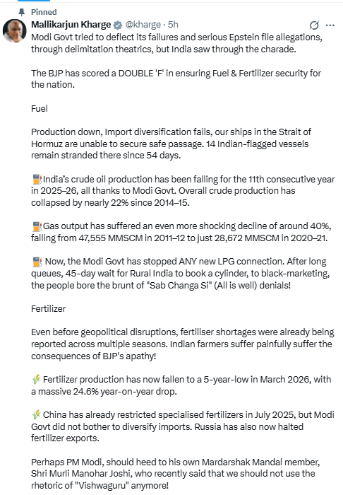 “PM Modi Govt tried to deflect its failures, and serious Epstein file allegations, through delimitation theatrics, but India saw through the charade. The BJP has scored a DOUBLE ‘F’ in ensuring Fuel & Fertiliser security for the nation”, Kharge said in a post on X.