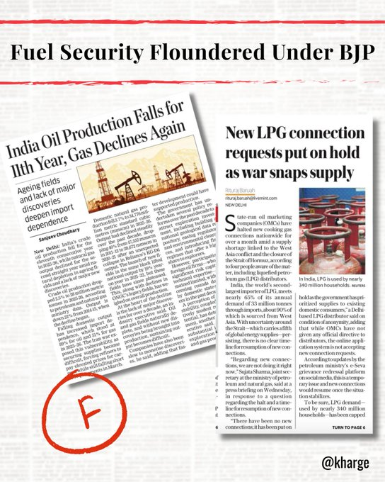 “Production down, Import diversification fails, our ships in the Strait of Hormuz are unable to secure safe passage. 14 Indian flagged vessels remain stranded there for 54 days. India’s crude oil production has been falling for the 11th consecutive year in 2025-26, all thanks to the Modi Govt. Overall crude