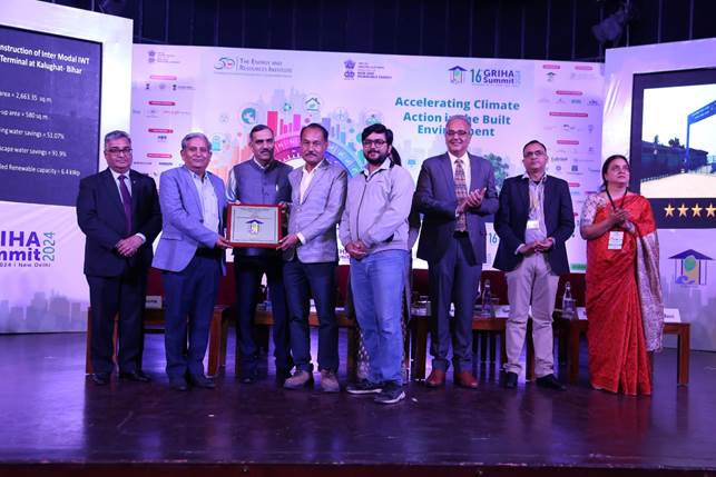 Inland Waterways Authority of India’s Intermodal Terminal (IMT) at Kalughat in Bihar has received five star SVAGRIHA rating from GRIHA council. The terminal is one among several infrastructural interventions made by Inland Waterways Authority of India (IWAI) under World Bank funded Jal Marg Vikas Project (JMVP) for capacity augmentation of National Waterway 1 – River Ganga. The award was received by Shri Arvind Kumar, Director, JMVP along with Shri Manish Tiwari, Specialist (Environment Impact Assessment), JMVP and Shri J J Patel, Project Manager, Sanjay Construction Company – the contractor agency.