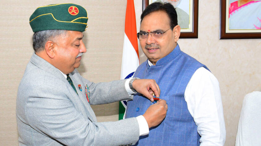 On the occasion of Armed Forces Flag Day, Chief Minister Shri Sharma symbolically received a flag (badge) from Brigadier Virendra Singh Rathore, Director of the Soldiers’ Welfare Department, at the Chief Minister’s residence on Friday. The Chief Minister also made an online contribution towards the welfare of soldiers and their families.