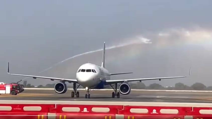 Lucknow/Noida : Chief Minister Yogi Adityanath’s vision came to fruition on Monday when the first aircraft touched down at Noida International Airport (Jewar), realising a decades-old dream. The IndiGo flight was greeted with a ceremonial water cannon salute upon its arrival.