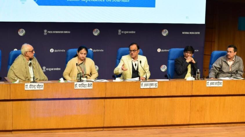 A press conference led by Prof. Ajay Kumar Sood, Principal Scientific Adviser (PSA) to the Government of India was held today at the National Media Centre, New Delhi about the recently launched One Nation One Subscription scheme. The panel of experts on the dais included Dr. Parvinder Maini, Scientific Secretary, Office of the PSA; Prof. Abhay Karandikar, Secretary, Department of Science and Technology; Mr. P.K. Banerjee, Joint Secretary, Department of Higher Education; Prof. Virander Chauhan, Former Director, International Centre for Genetic Engineering and Biology; and Ms. Remya Haridasan, Scientist ‘D’, Office of the PSA. The discussion was moderated by Smt. Mattu J.P. Singh, Director General, Press Information Bureau.