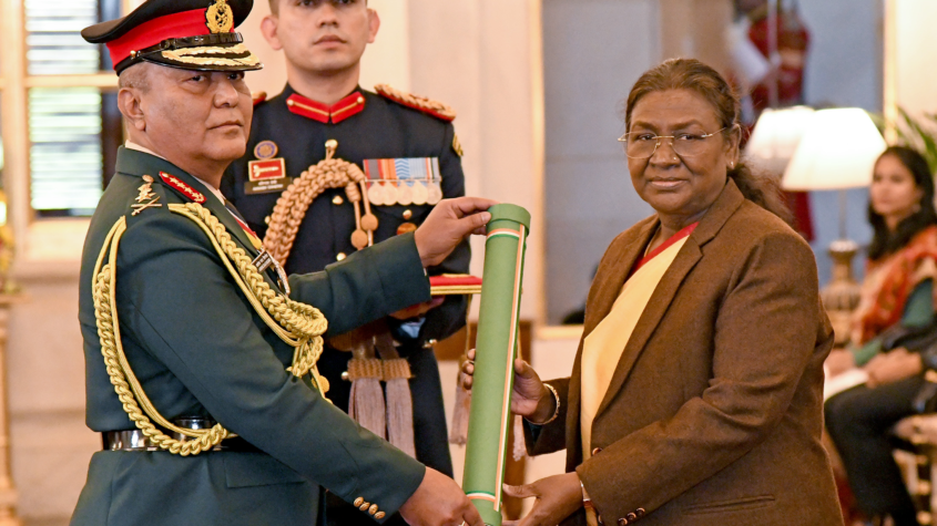 The President of India, Smt Droupadi Murmu conferred the Honorary Rank of General of the Indian Army on Suprabal Janasewashree General Ashok Raj Sigdel, Chief of the Army Staff, Nepali Army, at a special Investiture Ceremony held at Rashtrapati Bhavan today (December 12, 2024) for his commendable military prowess and immeasurable contribution to further fostering Nepal’s long and friendly association with India.