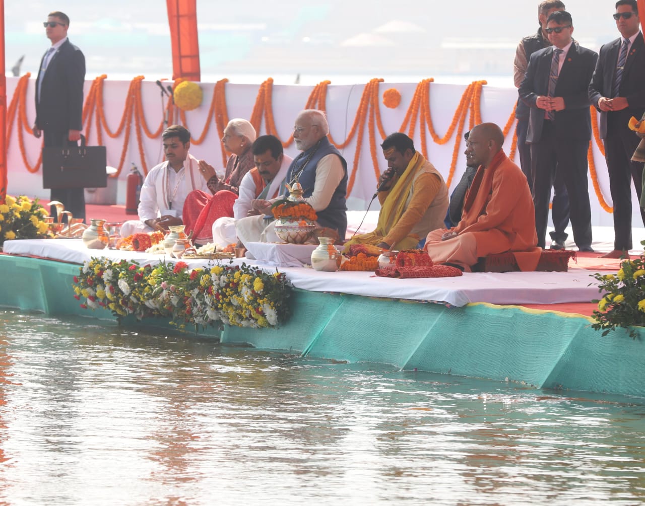 On this occasion, PM Modi performed the ‘aarti’ of the Triveni—the confluence of the Ganga, Yamuna, and Saraswati rivers—praying for global welfare and harmony. The rituals were conducted by ‘Tirth Purohits’ amidst the resonant chanting of Vedic mantras. He also offered Akshat, Chandan, Roli, flowers, and traditional clothing at the Triveni as part of the ceremony. Before the rituals, PM Modi sought the blessings of prominent saints. Chief Minister Yogi Adityanath and Governor Anandiben Patel accompanied the Prime Minister during the event.