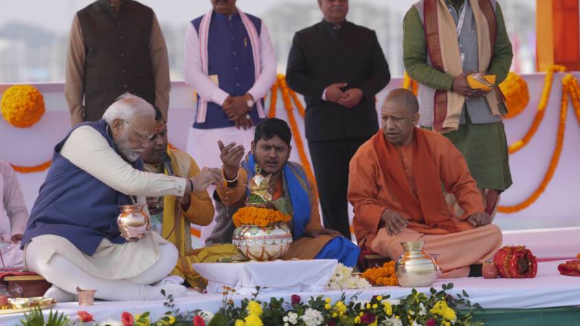 Prime Minister Modi performs the ‘Kumbhabhishek’ of the Kumbh Kalash at Sangam Nose