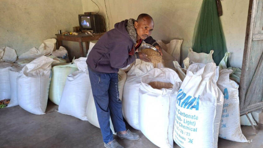 Mudmisni farmer Jahan Singh’s happiness is filled with paddy sack