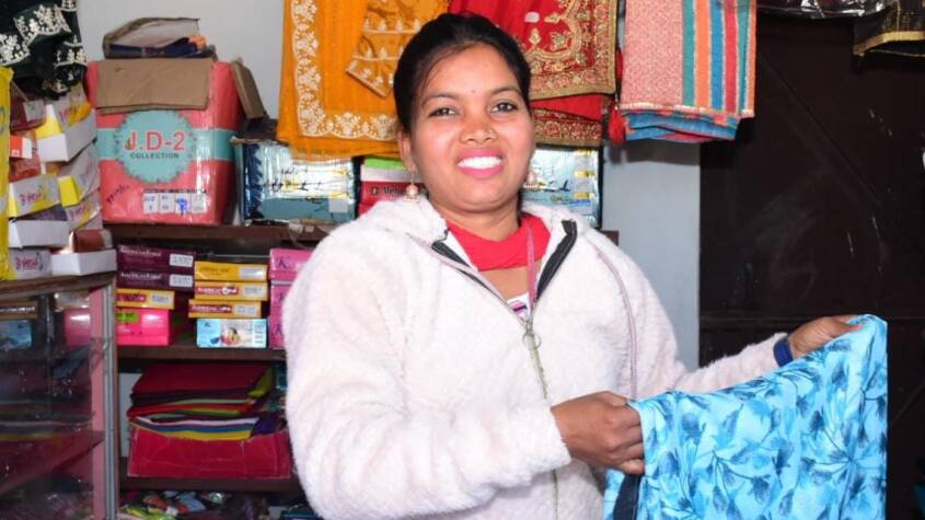 Lakhpati Didi Smt. Divya Nishad told that after joining the National Rural Livelihood Mission Bihaan, there was a change in my life and today my house is flourishing thanks to Bihaan. Being an introvert, joining Bihaan increased my confidence. I got to learn a lot during the training. She told that she started learning Bank Sakhi, Bank Mitra, book writing, work of the President and Secretary of the group and starting a small business. She told that she is associated with Jai Maa Ambe Self Help Group. While working in the group, her confidence increased and she started a small business by taking a loan through the group. She told that her annual income is more than 4 lakh rupees and she is doing multi-faceted work. Apart from Bank Sakhi, Bank Mitra, she has a shop of sari and readymade clothes for children in her village Bharregaon. She told that by taking loan from the group she has also started a grocery shop in her house. Now she has built her own concrete house. While joining livelihood based activities, she is doing sewing and other works.