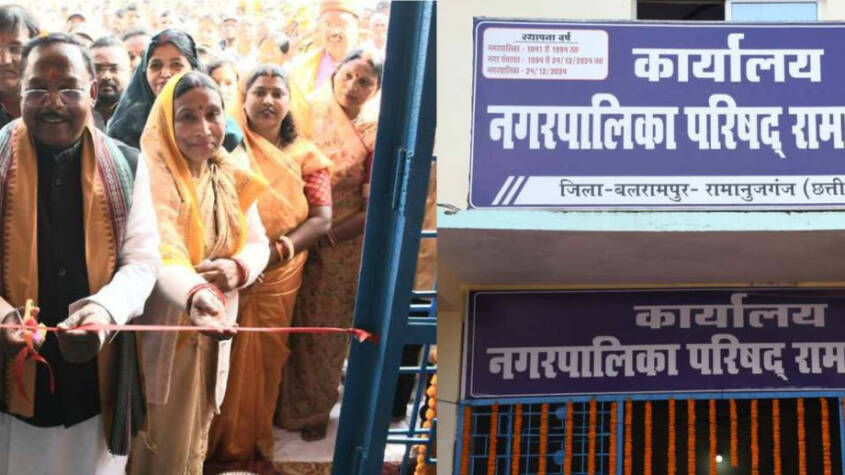 Agriculture Minister Shri Ramvichar Netam participated in various programs during his visit to Balrampur-Ramanujganj district today. He inaugurated the office upgraded from Nagar Panchayat Ramanujganj to Nagar Palika under Ramchandrapur development block of the district by cutting the ribbon. Minister Shri Netam congratulated and wished the people of the area for the new Nagar Palika.