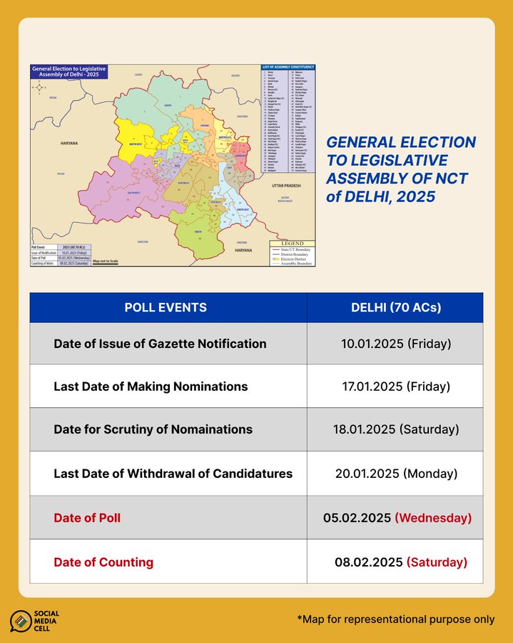 Chief Election Commissioner (CEC) Rajiv Kumar announced on Tuesday that the Delhi Assembly elections will be held on February 5, with the counting of votes scheduled for February 8. The last date for filing nominations is January 17, followed by the scrutiny of nominations on January 18. Candidates will have until January 20 to withdraw their nominations.