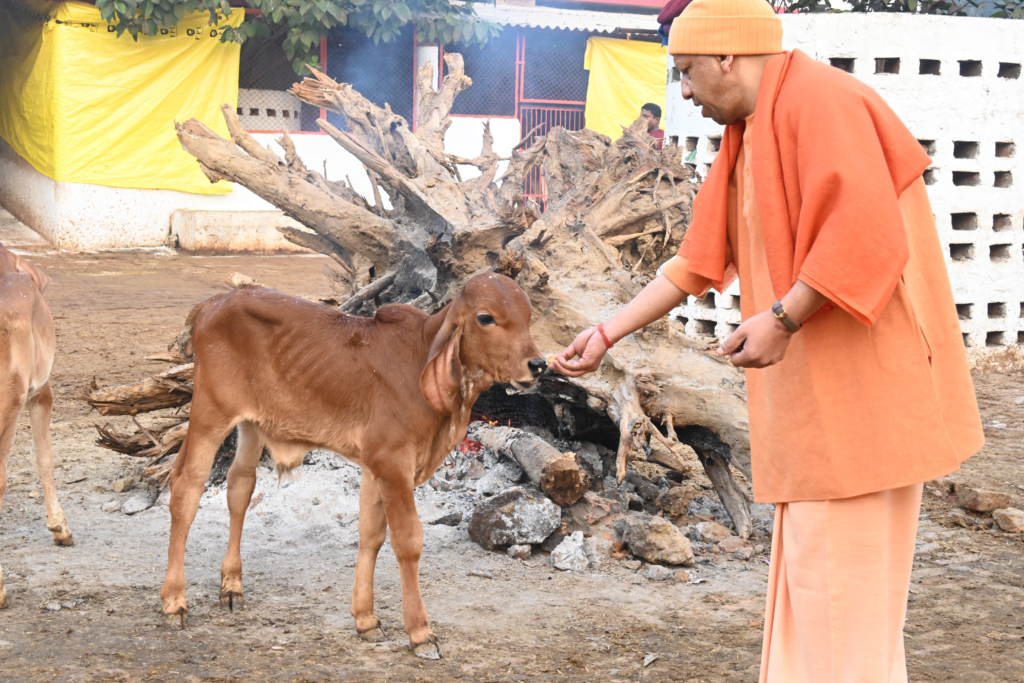 During his stay at Gorakhnath Temple, Chief Minister Yogi Adityanath followed his traditional daily routine. On Monday morning, he paid respects to Guru Gorakhnath and offered prayers at the Samadhi Sthal of his Gurudev, Brahmalin Mahant Avedyanath. Afterward, he visited the temple premises and proceeded to the temple’s cowshed, where he spent time performing Gausewa (cow service).