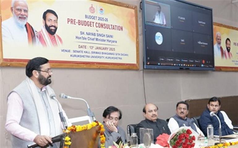 The Chief Minister, while presiding over a pre-budget consultation meeting with youth at Kurukshetra University on Monday. Sports Minister Sh. Gaurav Gautam also remained present in the meeting.