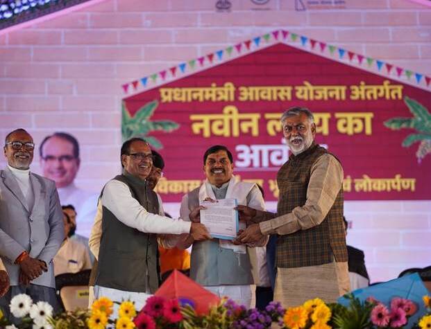 Under Prime Minister Narendra Modi’s ambitious program of House for the Poor, today 8.21 lakh families received the gift of pucca houses. In Madhya Pradesh these pucca houses will be built for the poor at a cost of Rs 12,636 crores. Union Minister Shri Shivraj Singh informed that 8.21 lakh families will also get houses by April-May, for which he handed over the approval letter to the Chief Minister at once on stage. Shri Shivraj Singh said that Madhya Pradesh will get a total of about 14 lakh houses from the Centre in a year, which it had never got before.