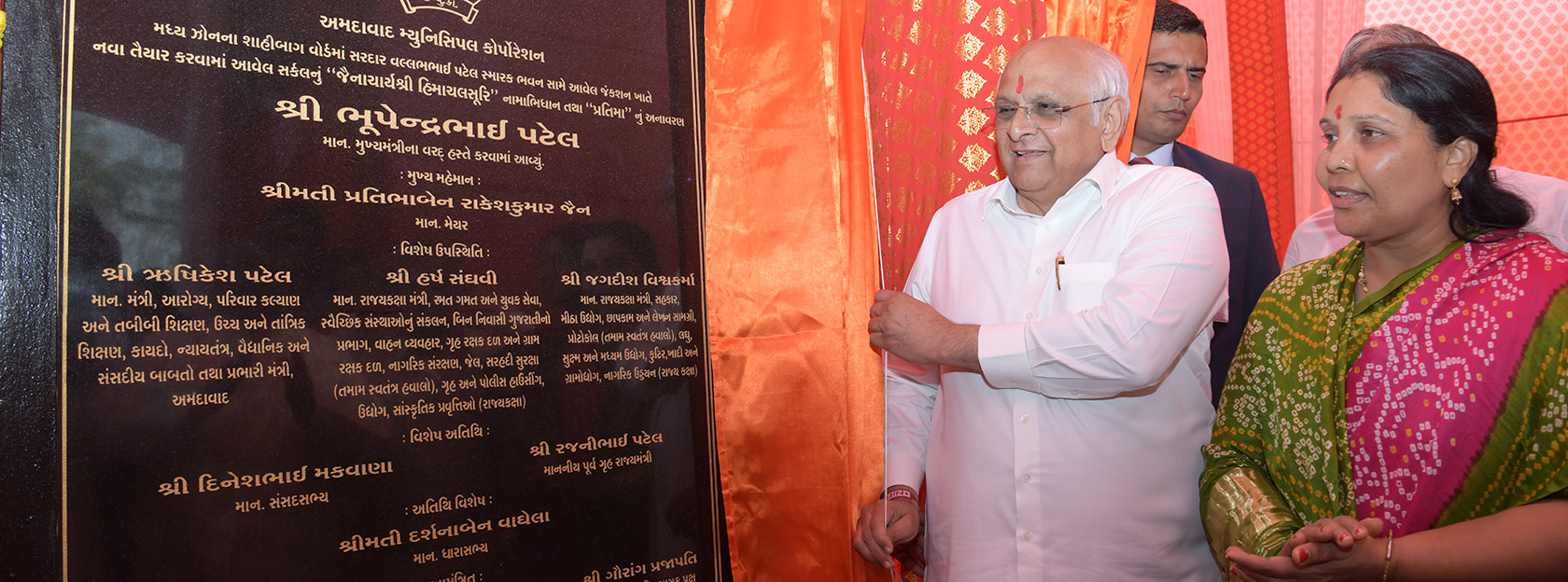 CM Bhupendra Patel unveils the statue of Jainacharya Shri Himachalsuriji near the Sardar Patel Memorial Building