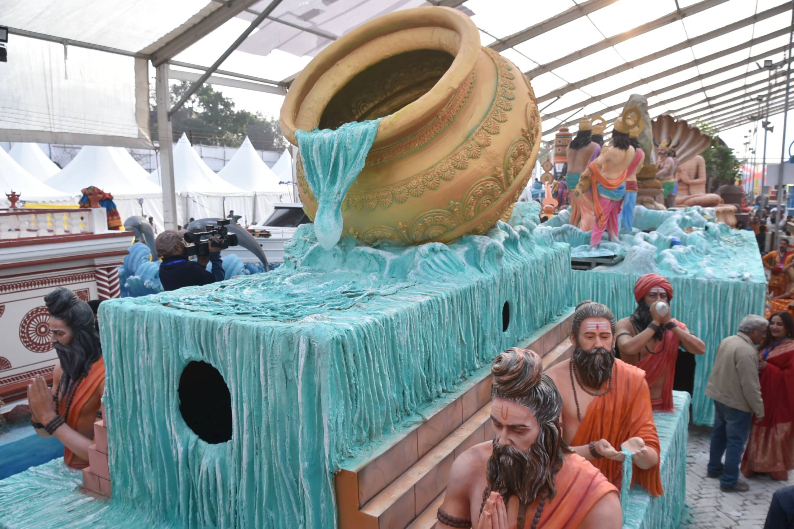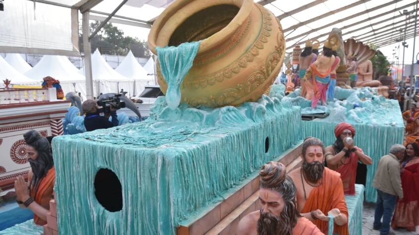 At its forefront stands a grand, forward-leaning replica of the ‘Amrit Kalash,’ symbolizing the flow of divine nectar (Amritdhara). Surrounding it, scenes of saints and sages blowing conches, meditating, and sipping holy water, along with devotees taking ritualistic dips at the confluence, bring to life the spiritual essence of the event. Visitors from across the globe will witness this unprecedented gathering under the leadership of the Yogi Adityanath government.