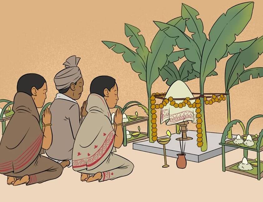 During this festival, three Gods namely Grihadam, Dam Changphi and Me Dam Me Phi are worshipped. Worship is done by Ahom priests Deodhai and Bailung by chanting Tai mantras. The festival has its roots in the ancestral worship of Confucianism in ancient China which later developed into the Dam-Phi meaning ancestor worship tradition of the Ahom people. Ancestor worship culture began with the Chinese philosopher Confucius and is still practiced among the Chinese. The rituals of observing this festival is written in the book Khyek-lai or Lit Lai Me-Dam-Me in Tai-Ahom language.