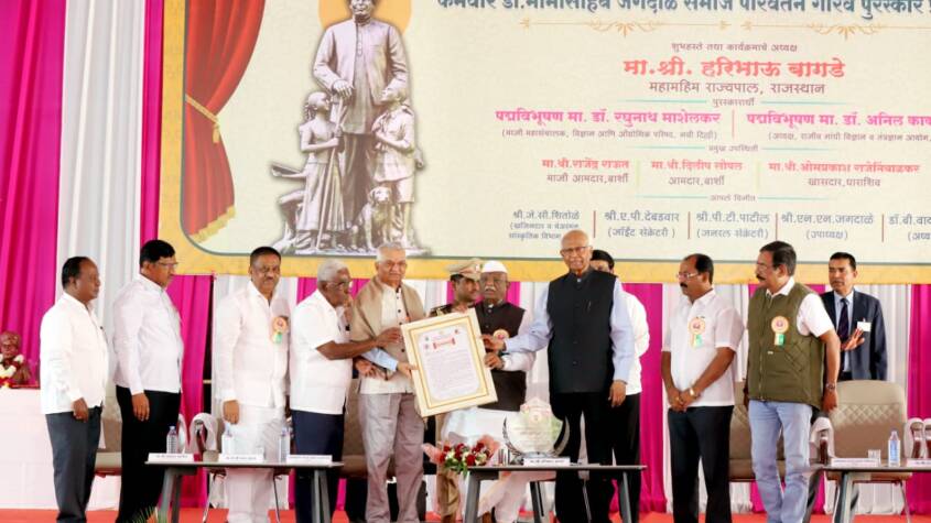 On Wednesday, at the 122nd birth anniversary celebration of Karmaveer Dr. Mamasahib Jagdale, the founder of Shri Shivaji Shikshan Prasarak Mandal in Barshi, Maharashtra, Padma Vibhushan awardees Shri Raghunath Mashelkar and Shri Anil Kakodkar were honored with the Karmaveer Dr. Mamasahib Jagdale Social Transformation Award.