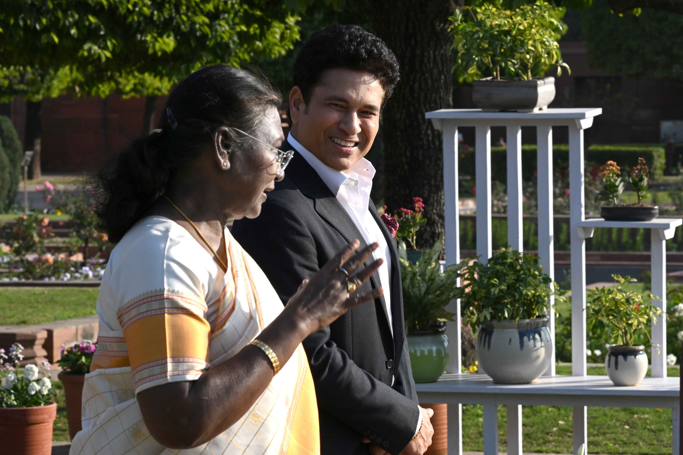Cricket legend Shri Sachin Tendulkar, along with his family members, called on the President of India, Smt Droupadi Murmu at Rashtrapati Bhavan today (February 6, 2025). The President and Shri Tendulkar also took a round of Amrit Udyan.