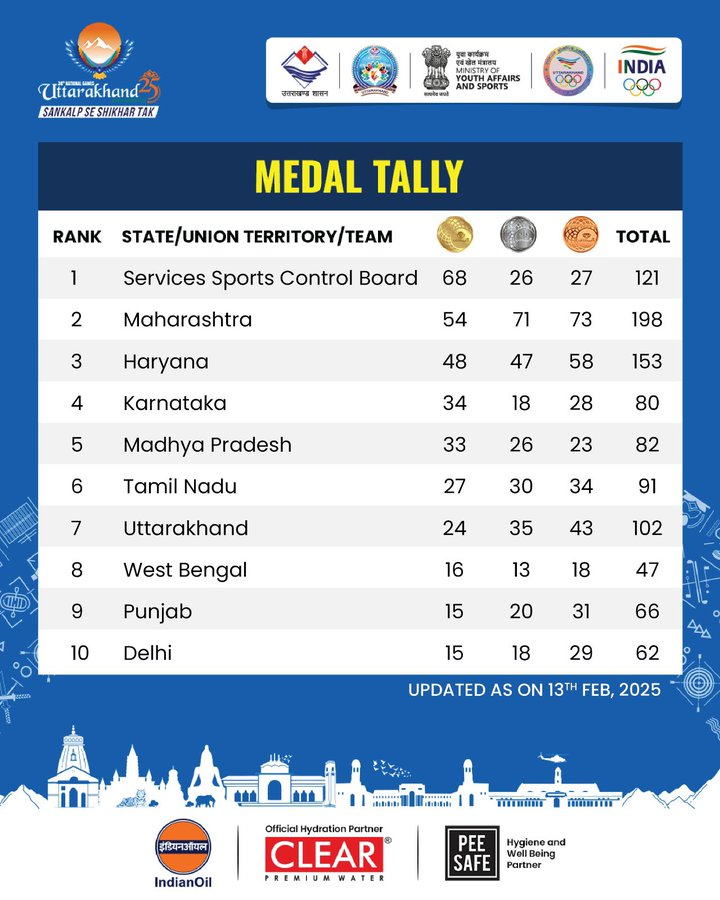 The closing ceremony of the 38th National Games concluded with Haryana emerging as the second runner-up, securing 48 gold, 47 silver, and 58 bronze medals. Maharashtra claimed the first runner-up position, with 54 gold, 71 silver, and 76 bronze medals. The overall champions were the Services Sports Control Board, who dominated the event with 68 gold, 26 silver, and 27 bronze medals. The event concluded on a triumphant note, and as the focus shifted to the future, Meghalaya was given the honor of hosting the 39th National Games in 2026, ushering in an exciting new chapter for this prestigious competition.