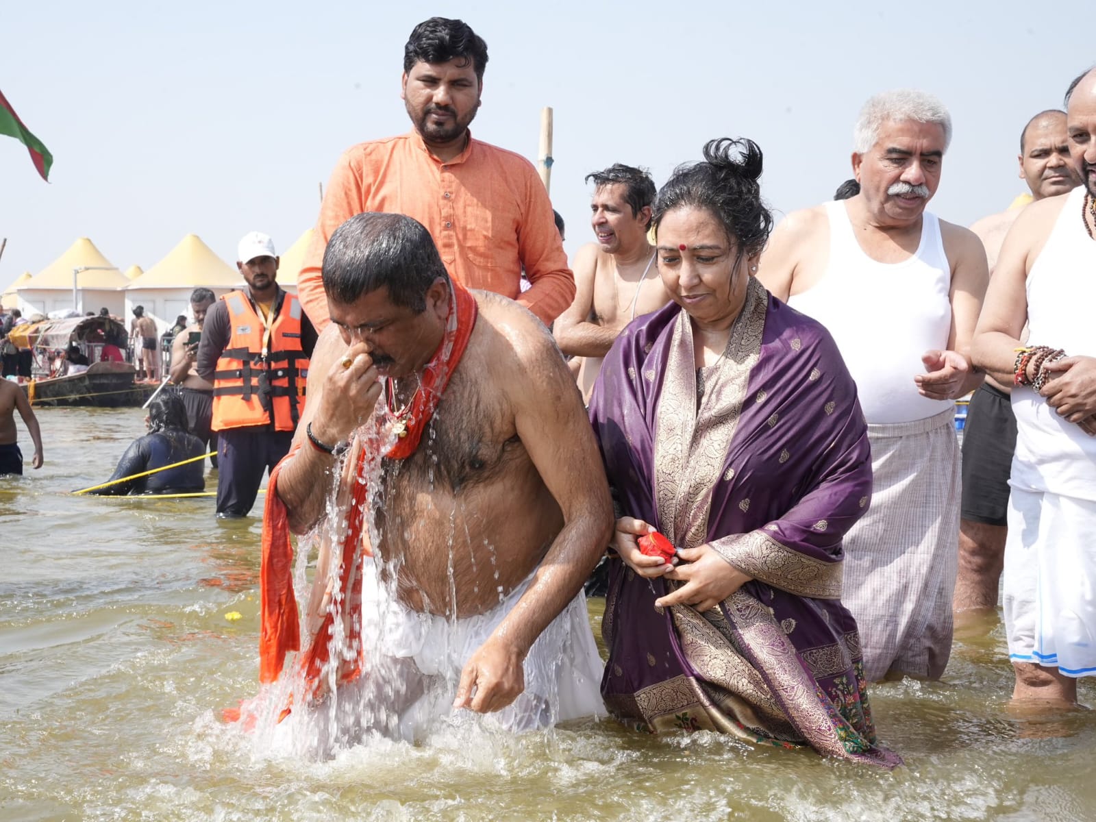 Several Uttar Pradesh ministers also participated in the holy ritual. Among them were the Minister for MSMEs, Khadi and Village Industries, Silk Industry, Handloom, and Textiles Rakesh Sachan, Higher Education Minister Yogendra Upadhyay, and Minister of State for Transport (Independent Charge) Dayashankar Singh. The ministers performed a traditional puja for Maa Ganga and prayed for the nation’s and its people’s well-being.