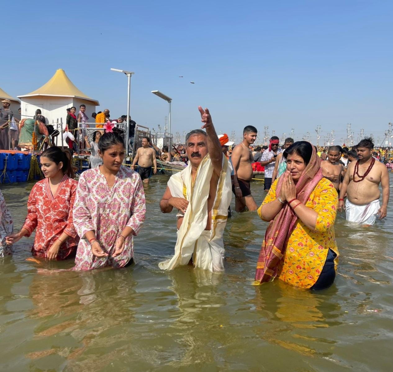 Himachal CM Sukhvinder Singh Sukhu, accompanied by his family, took a holy dip in the Triveni Sangam and prayed for the peace and prosperity of the nation and his state. His wife, Kamlesh Thakur, expressed her reverence for the sacred confluence, calling it the essence of Hindu spirituality.