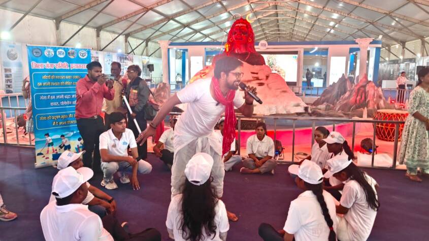 Youth volunteers stationed at the ghats and the Namami Gange exhibition creatively raised awareness about Ganga and environmental protection through impactful theatrical performances. As part of an eco-friendly initiative, Namami Gange cloth bags were distributed to devotees visiting the exhibition.