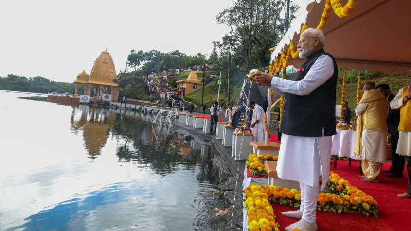 Prime Minister Shri Narendra Modi visited the sacred Ganga Talao in Mauritius today. He offered prayers and immersed the holy water from the Triveni Sangam at the sacred site.