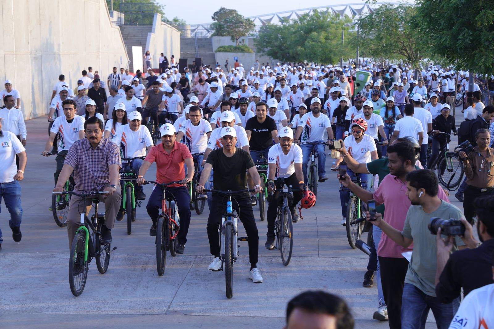 Dr. Mansukh Mandaviya leading the charge at the iconic Sabarmati Riverfront in Ahmedabad today. Organized by SAI Gandhinagar, the event saw around 650 cyclists, including members of the Indian Medical Association (IMA) Gujarat, Ahmedabad Medical Association, and MPs Hasmukhbhai Patel and Dineshbhai Makwana. The event was flagged off by Paralympian athlete Bhavana Choudhary.