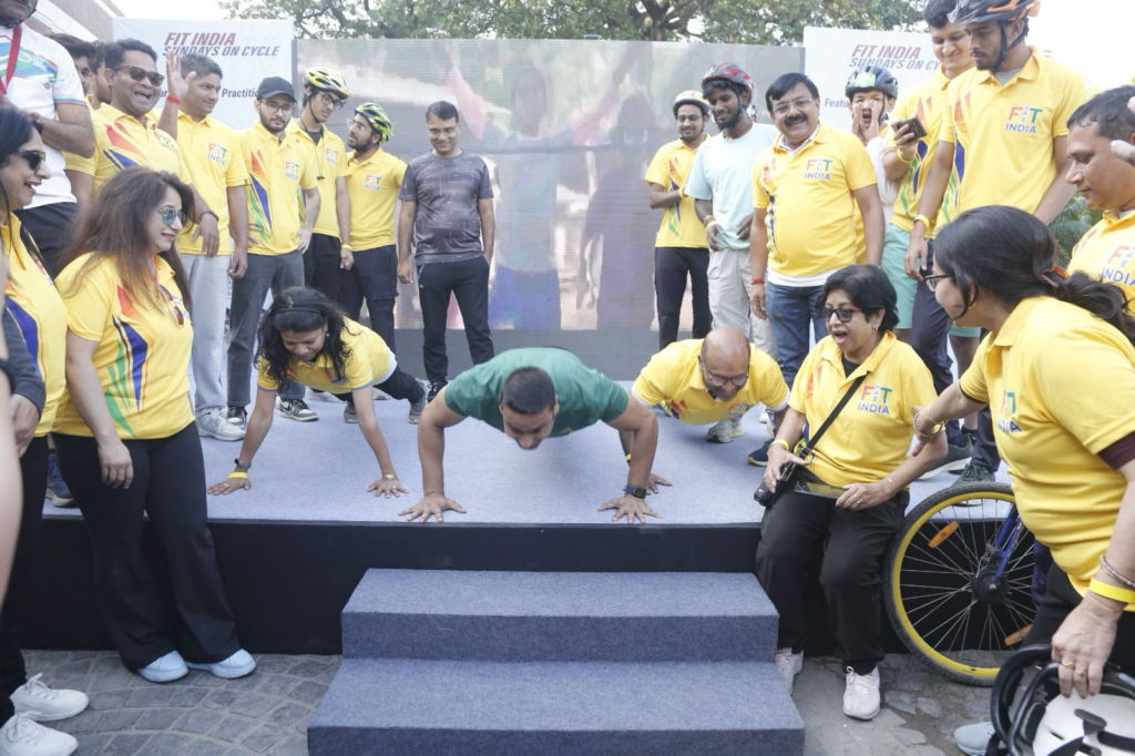 Dr. Mansukh Mandaviya Leads Fit India Cycling in Ahmedabad; Rohtash Chaudhary Powers Delhi with Push-ups