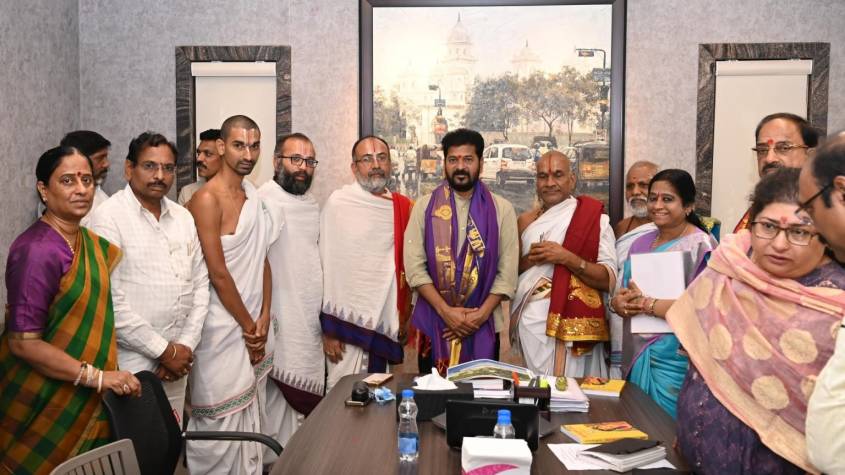 Minister Konda Surekha, along with the priests and officials of the Bhadrachalam Sri Sitaramachandra Swamy temple, invited Chief Minister A. Revanth Reddy to participate in the Sri Rama Navami Thirukalyana Brahmotsavam. The invitation was presented at the CM’s residence in Jubilee Hills.