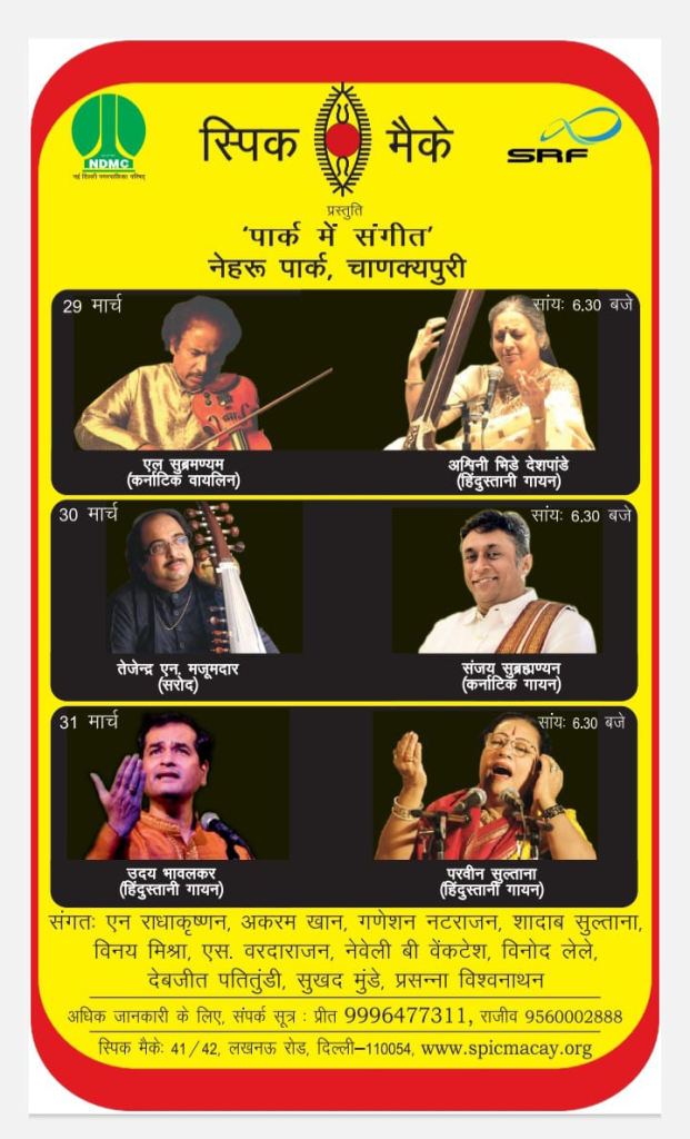 The New Delhi Municipal Council (NDMC), in collaboration with SPIC MACAY, is organizing a three-day classical music festival from March 29 to March 31, 2025, under the “Music in the Park” series at Nehru Park, Chanakyapuri, New Delhi. The concerts will take place every evening from 6:30 PM onwards. Entry to the event will be from Neeti Marg and is free for all.