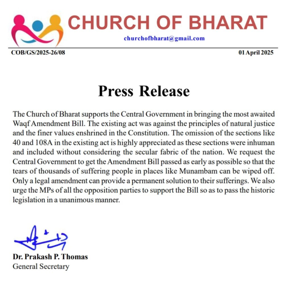 The Church of Bharat supports the Central Government in introducing the much-awaited Waqf Amendment Bill. The existing Act contradicts the principles of natural justice and the core values enshrined in the Constitution. The removal of Sections 40 and 108A from the existing Act is highly appreciated, as these provisions were unjust and did not align with the secular fabric of the nation.