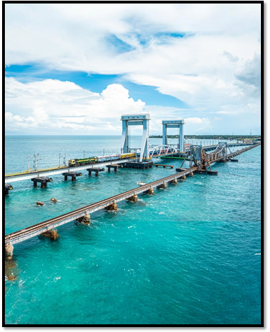 The New Pamban Bridge stands as a testament to India’s engineering prowess and visionary infrastructure development. Rooted in history, its story traces back to 1914 when British engineers constructed the original Pamban Bridge, a cantilever (a long piece of metal or wood that extends from a wall to support the end of a bridge) structure with a Scherzer Rolling Lift span to connect Rameswaram Island with mainland India.