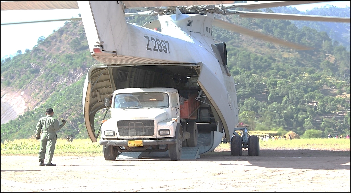 With a view to accelerate progress of construction of Approach road up to the remotest part of the project – Sawalkote, airlift of heavy construction machineries using army helicopters from Jammu airport was done. A table top helipad was constructed by levelling a 100 m x 40m stretch of land near Surukote village in between Dugga and Sawalkote using mere hand tools. MI – 26 Helicopters was used for Helilifting of heavy construction machines; sorties had been conducted and 226 MT load was air lifted to Surukote.